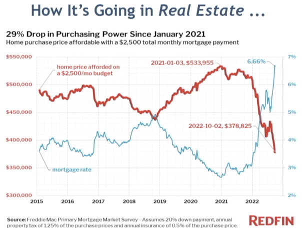 What do you get when you combine rapid appreciation in house prices with a surge in the cost of financing and no significant income growth? With an interest rate of 6.66% as of early October, the same mortgage payment will buy a $379,000 house. This is roughly a 30% decline in affordability!