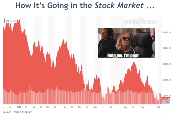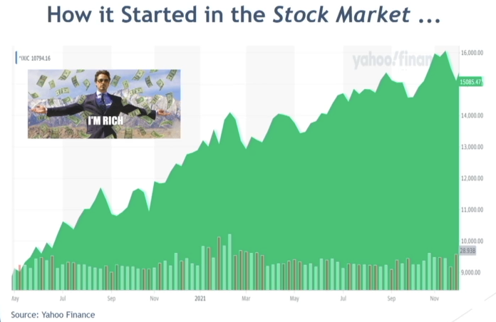 Below is a chart of the NASDAQ (from May-Nov. 2021). You could pick any significant market index, and stocks were soaring. Everybody felt wealthy, and it was a great time to be an investor.