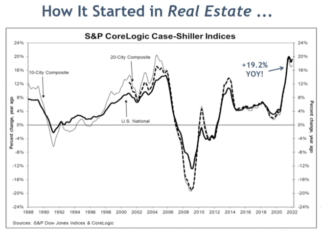 Coming out of the COVID low, when interest rates were slashed to zero and hundreds of billions, if not trillions of dollars, were thrown at the economy, we saw housing in the peak months of 2021 and late 2020 appreciating more than 19%. That even eclipses the rate of appreciation we saw leading up to the most significant US housing bubble in history (2006-7).